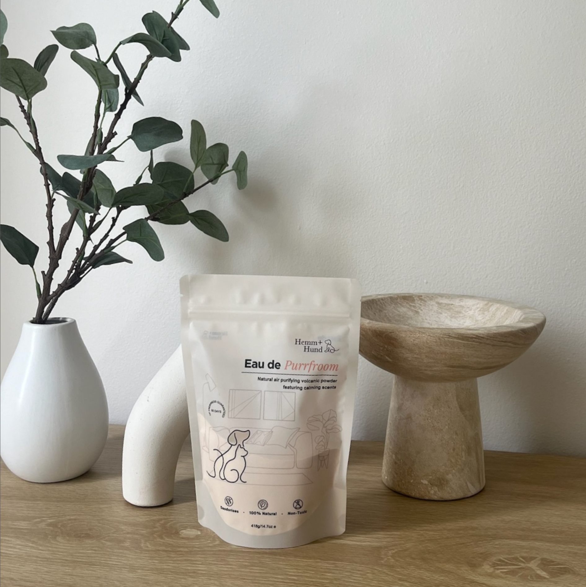 Eau de Purrfroom is a natural, non-toxic way to keep your home smelling fresh. It uses Zeolite, a volcanic mineral that doesn’t just cover up pet odours but actually absorbs and neutralises them, leaving your space clean and inviting.